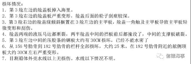 事故導致了百萬美金的巨大損失;幸運的是,事故發生時沒有任何人員站立在該艙左側甲板上;可以想象的是:如果當時有人站立在左側,則很難幸免!