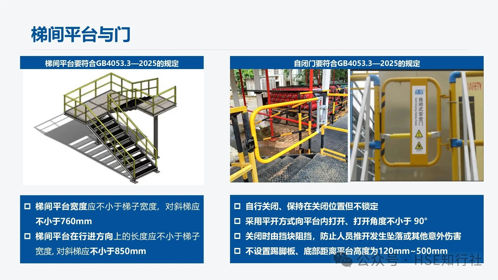 斜梯的使用說明和警示信息,主要從“斜梯的使用說明”、“斜梯的警示信息”、“自閉門的警示信息”三方面來完善,同時涉及到的安全色和安全標志應符合 GB2894 的規定。