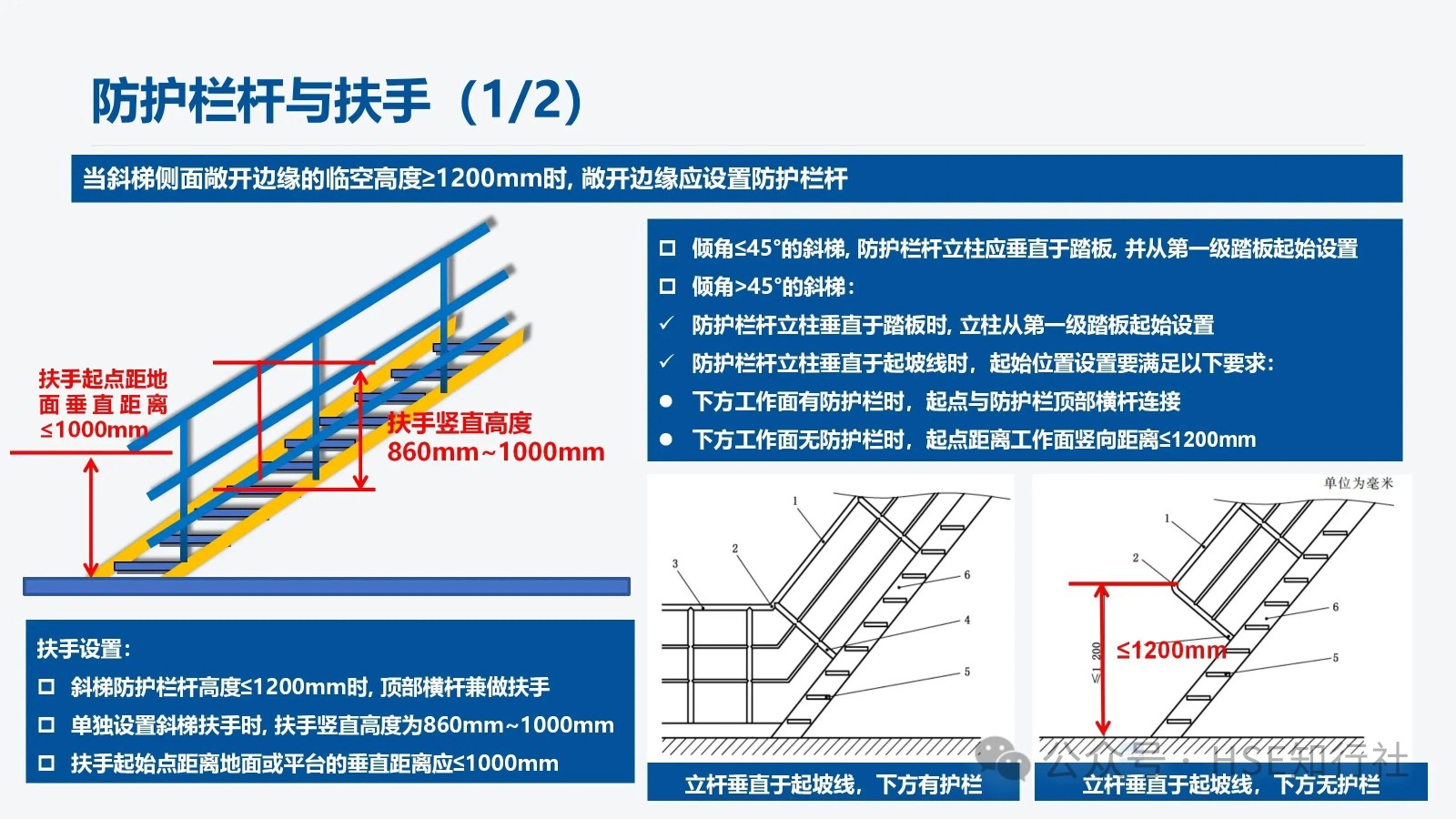 • 當斜梯側面敞開邊緣的臨空高度≥1200mm時, 敞開邊緣應設置防護欄桿。