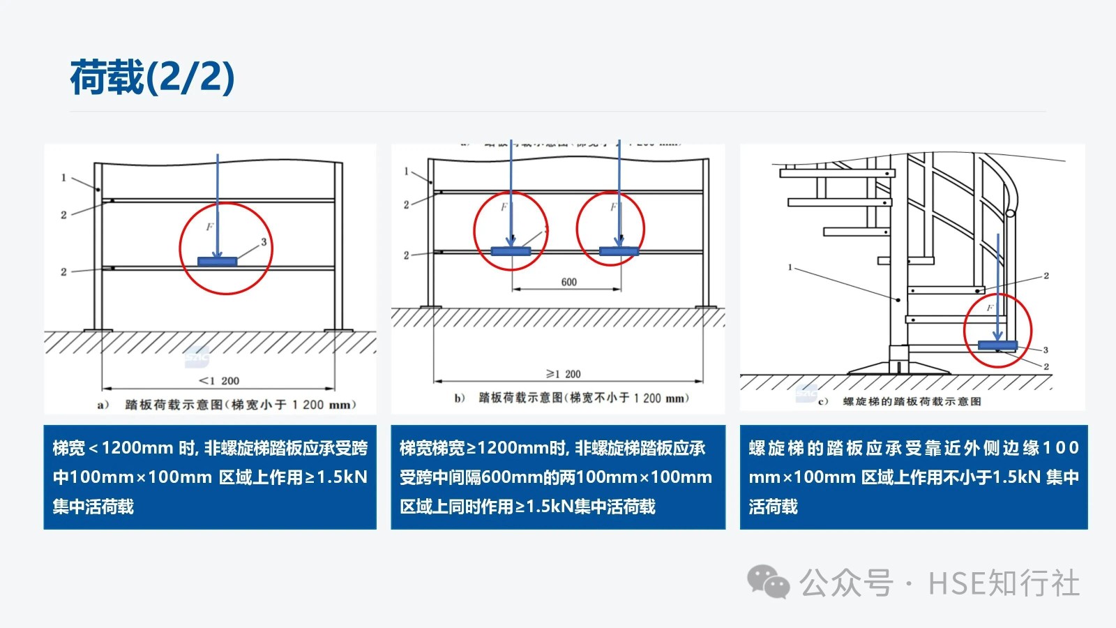2、梯寬梯寬≥1200mm時, 非螺旋梯踏板應承受跨中間隔600mm的兩100mm×100mm區域上同時作用≥1.5kN集中活荷載。