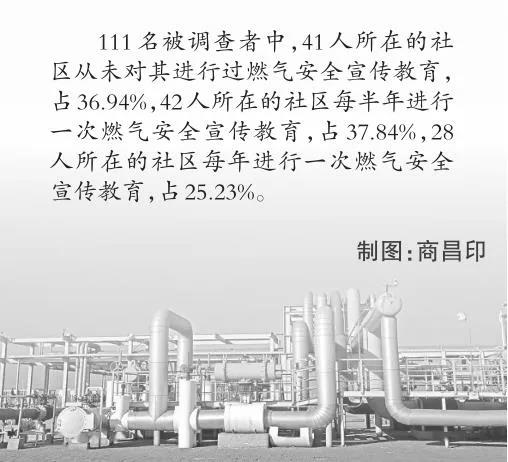 這一點,從記者的問卷調查結果中也得到了印證。111名被調查者中,41人所在的社區從未進行過燃氣安全宣傳教育,占36.94%,42人所在的社區每半年進行一次燃氣安全宣傳教育,占37.84%,28人所在的社區每年進行一次燃氣安全宣傳教育,占25.23%。