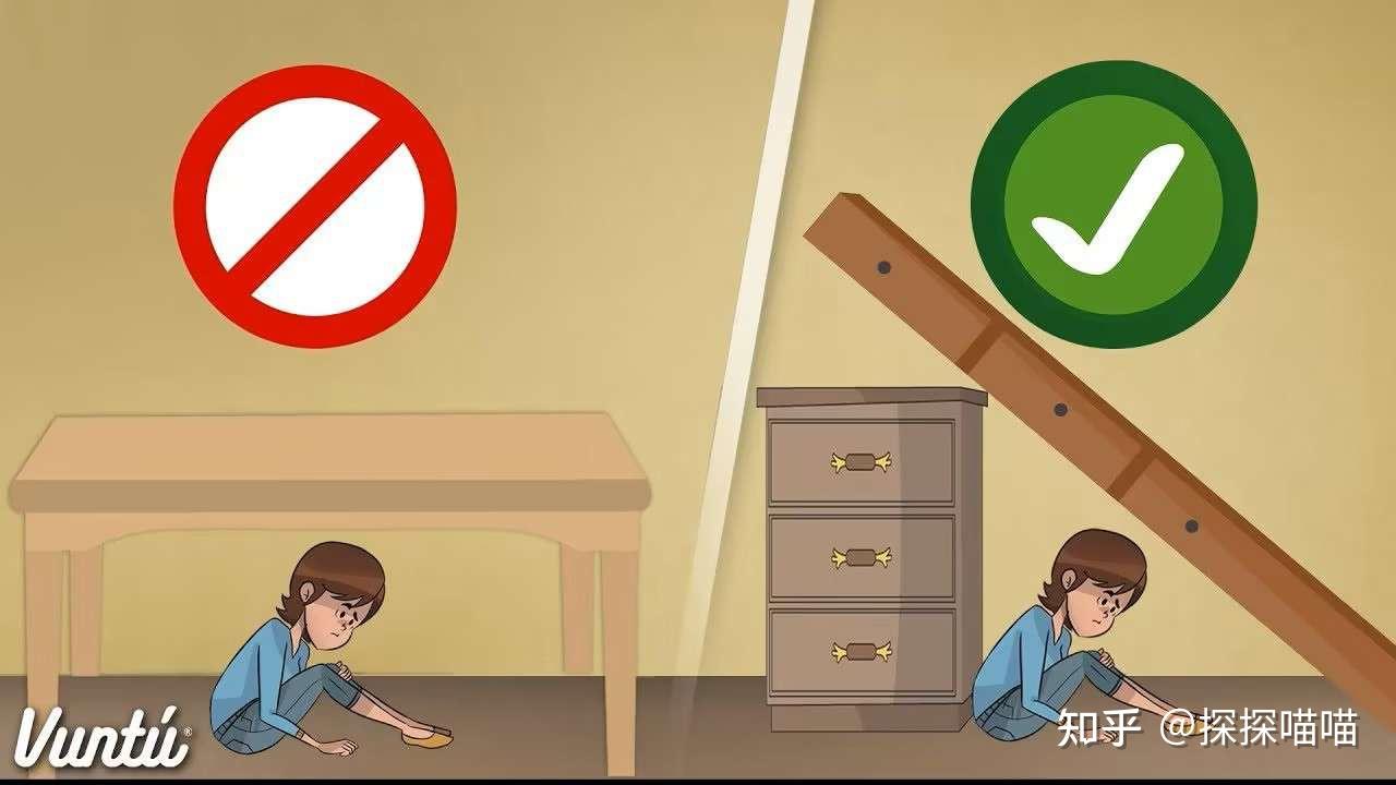 - 次選結實的桌子、床旁(注意:不是鉆下面,而是緊貼側面,形成“生存三角”)。