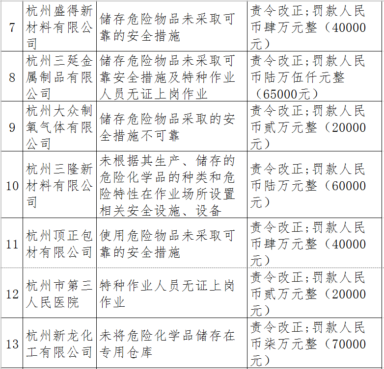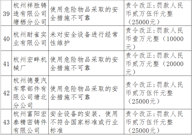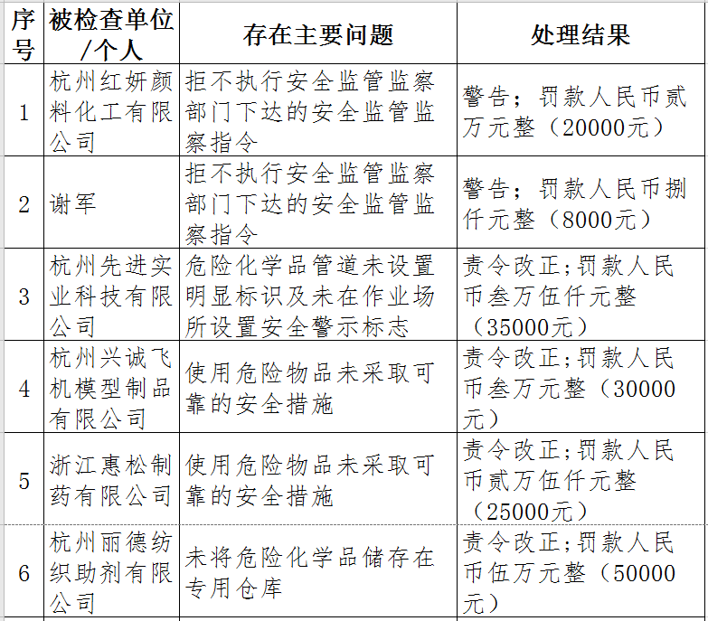 據了解,今年上半年,杭州市應急管理局一手抓駐企復工復產、一手抓安全生產,已完成年度執法計劃、專項檢查、聯合執法、信訪舉報核查等,并對檢查中發現的安全生產違法違規企業(個人)進行了處罰。現對52家被行政處罰的企業(個人)進行曝光,希望各企業引以為戒!