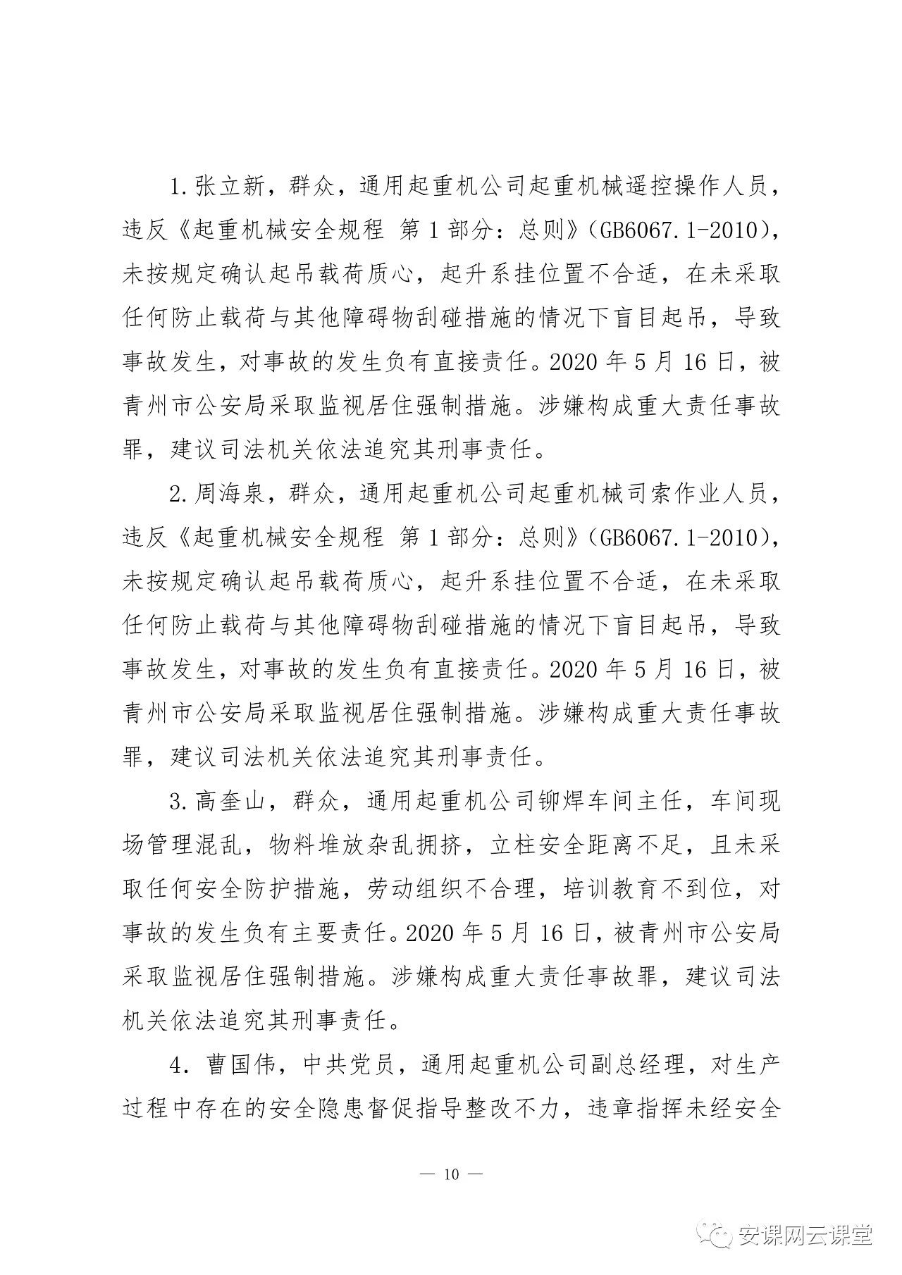 曹國偉,中共黨員,通用起重機(jī)公司副總經(jīng)理,對(duì)生產(chǎn)過程中存在的安全隱患督促指導(dǎo)整改不力,違章指揮未經(jīng)安全教育培訓(xùn)的工人上崗作業(yè),對(duì)事故的發(fā)生負(fù)有主要責(zé)任。