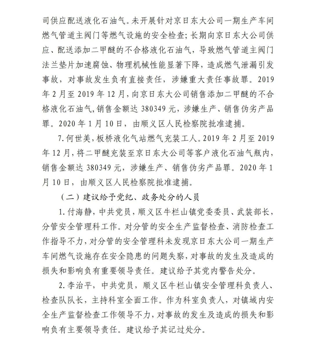 6.吳建新,板橋液化氣站工作人員,具體負責向京日東大公15司供應配送液化石油氣。未開展針對京日東大公司一期生產車間燃氣管道主閥門等燃氣設施的安全檢查;長期向京日東大公司供應、配送添加二甲醚的不合格液化石油氣,導致燃氣管道主閥門法蘭墊片加速腐蝕、物理機械性能顯著下降,造成燃氣泄漏引發 事故,對事故發生負有直接責任,涉嫌重大責任事故罪。2019 年 2 月至 2019 年 12 月,向京日東大公司銷售添加二甲醚的不合 格液化石油氣,銷售金額達 380349 元,涉嫌生產、銷售偽劣產品 罪。2020 年 1 月 10 日,由順義區人民檢察院批準逮捕。