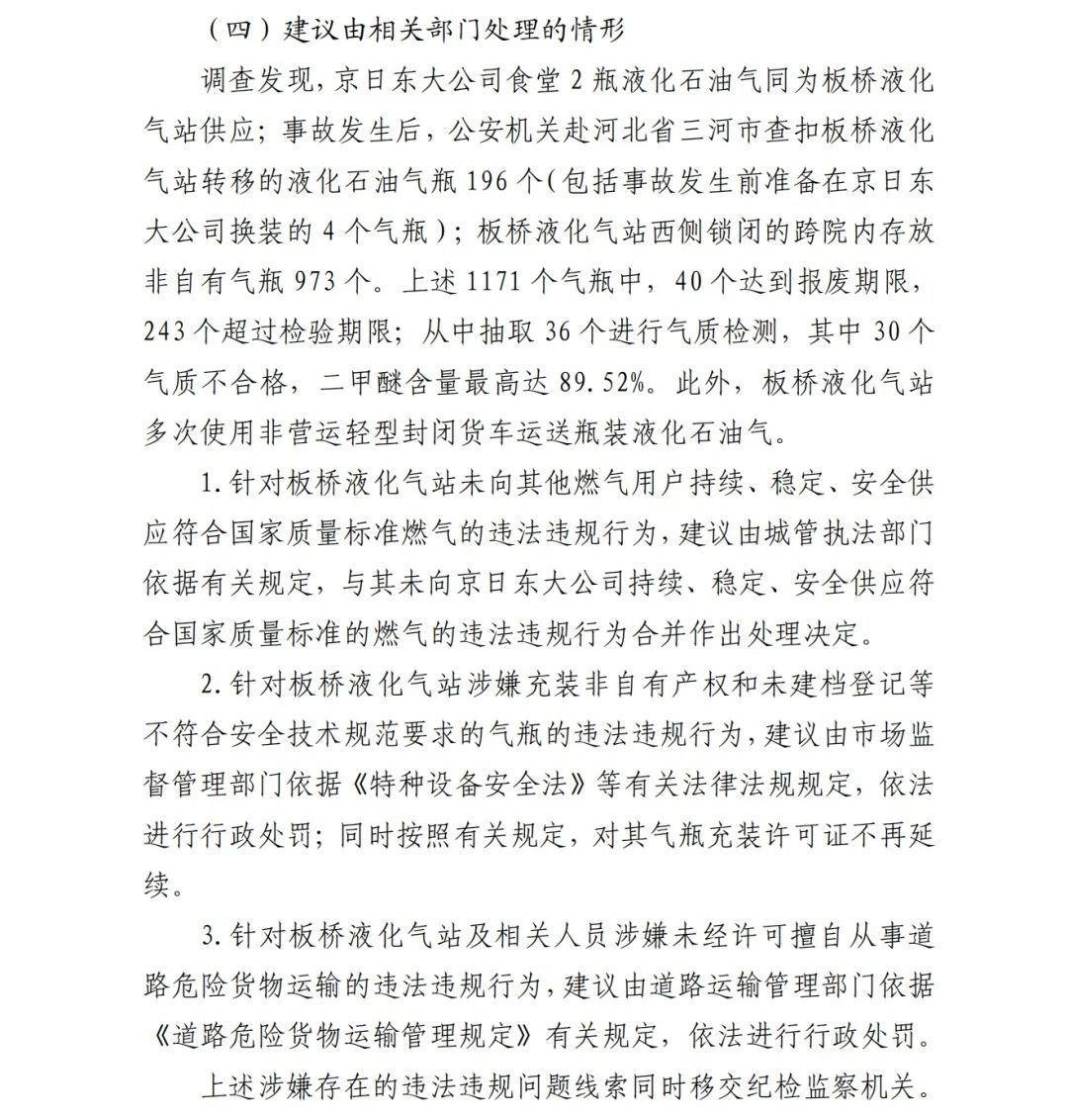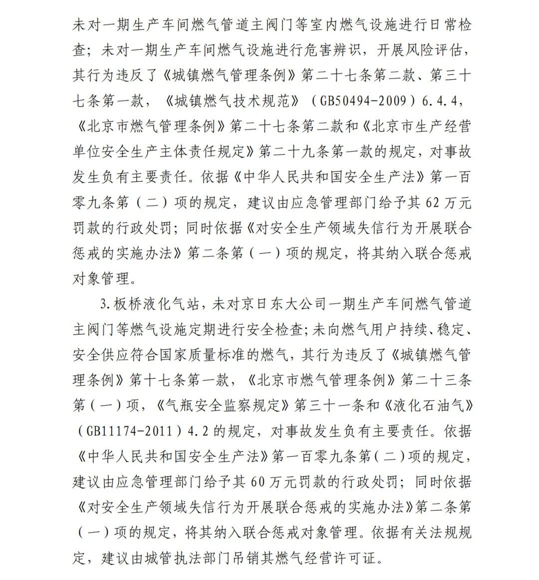4.方勇忠,曾先后擔任京日東大公司生活部副部長兼設備部部長助理、設備部部長、生產部部長兼設備部部長、總經理助理(2019年4月辭職)。2006年負責京日東大公司一期生產車間建設工作,期間未委托具有相應資質的施工單位,組織本單位人員自行建設安裝燃氣設施,導致燃氣設施安全隱患長期存在;2018 年負責一期生產車間內新建冷藏庫建設,將部分管道、閥門等燃氣設施封閉在通風不良的場所內,且未設置通風、燃氣泄漏報警等安全設施,對事故發生負有直接責任,涉嫌重大責任事 故罪。2020 年 1 月 23 日被順義公安分局刑事拘留,2 月 6 日取 保候審,建議依法追究刑事責任。