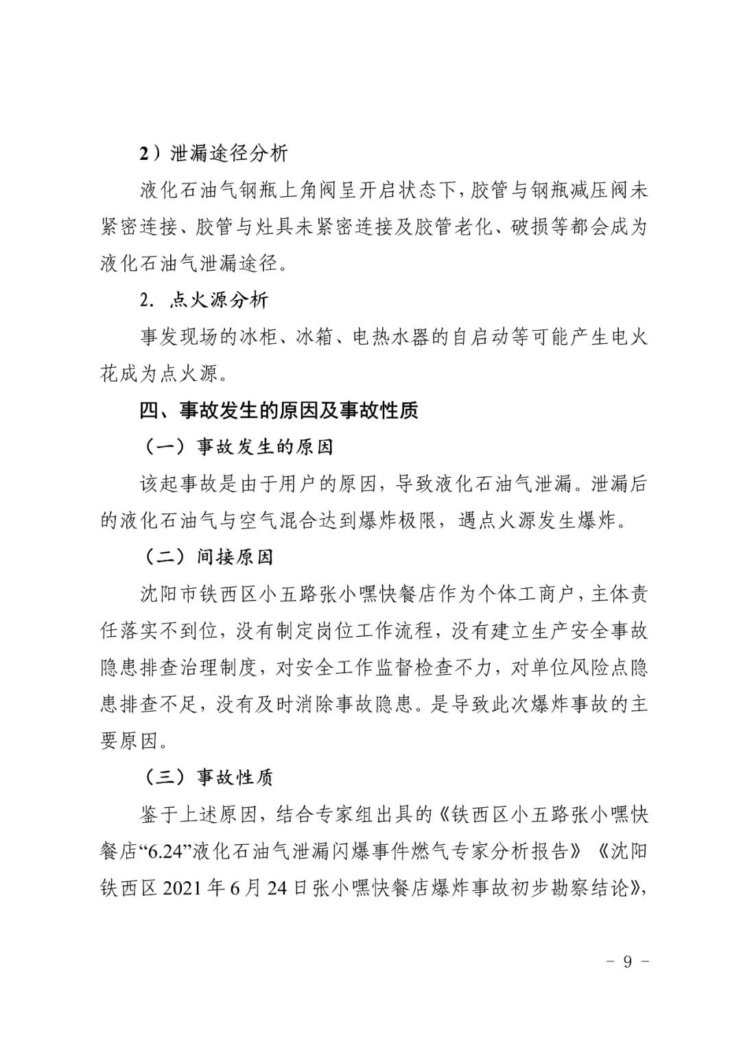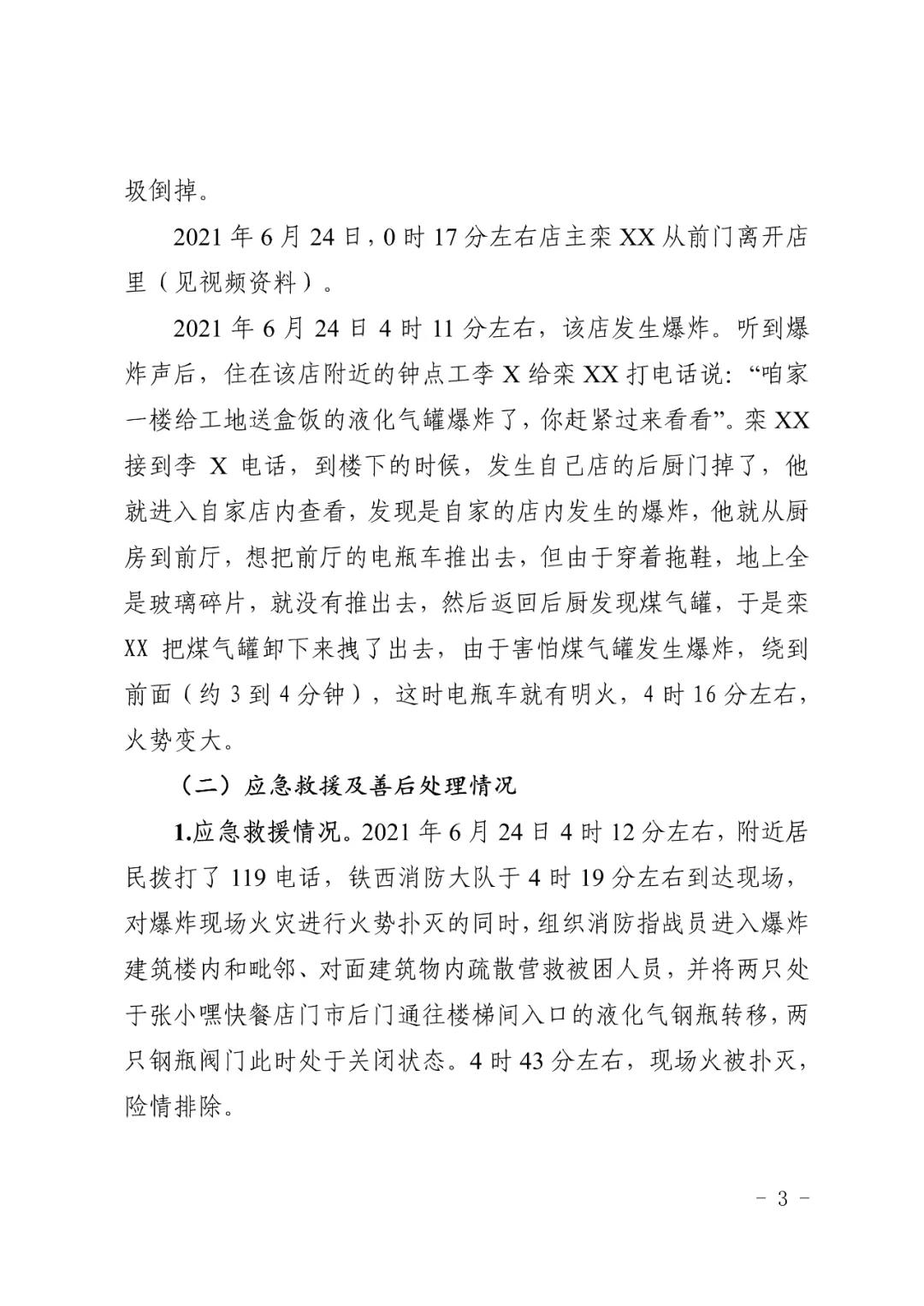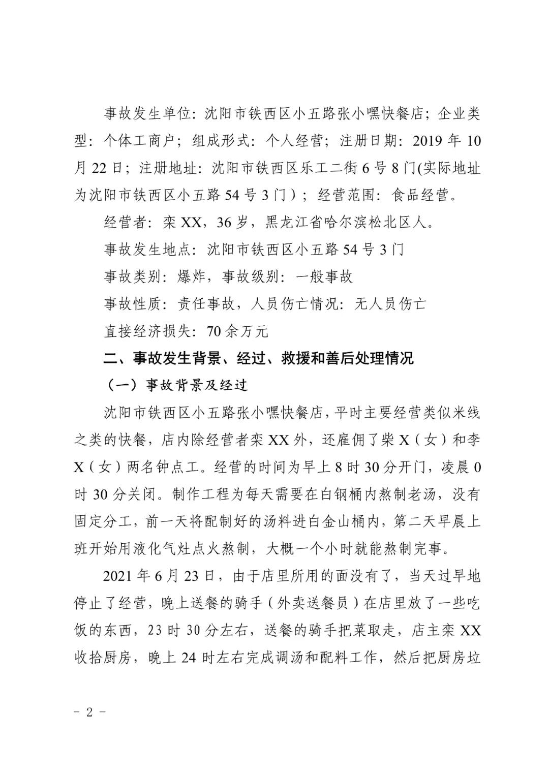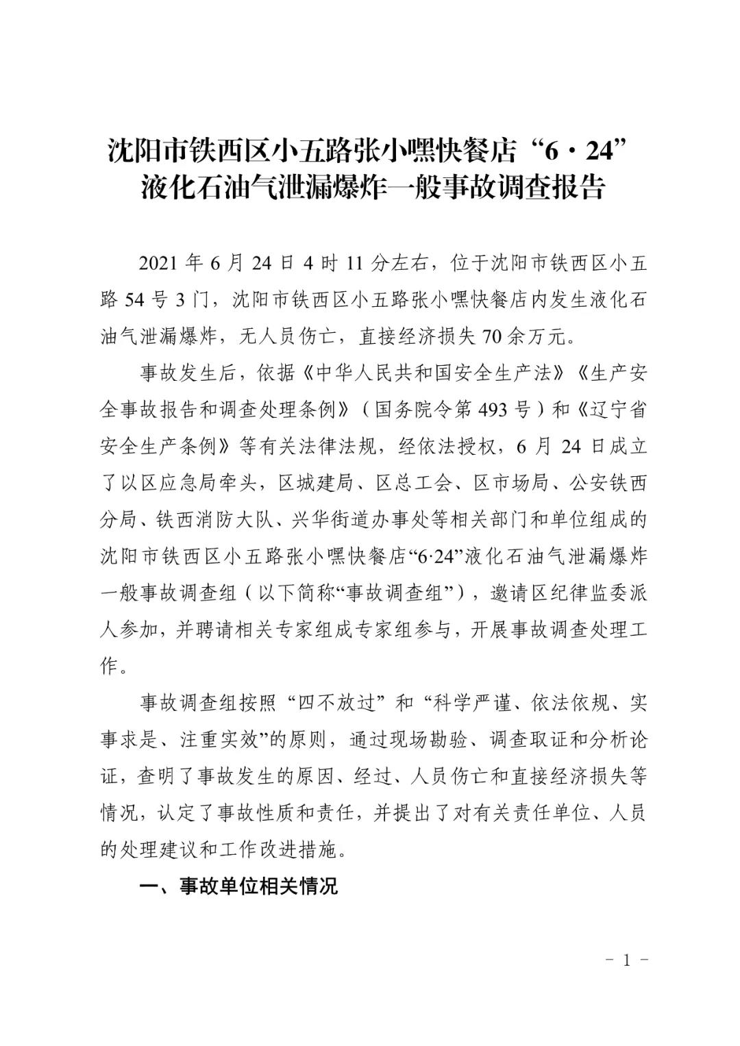 2021 年 6 月 24 日 4 時 11 分左右,位于沈陽市鐵西區(qū)小五路 54 號 3 門,沈陽市鐵西區(qū)小五路張小嘿快餐店內(nèi)發(fā)生液化石油氣泄漏爆炸,無人員傷亡,直接經(jīng)濟損失 70 余萬元。