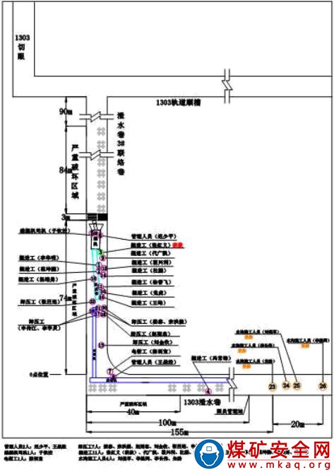 掘二隊 7 人正在距離拐點 155 米以外砌筑水溝,當班驗收員夏付人也在這個位置,沖擊氣浪將其安全帽沖掉。發生事故后,夏付人和其他 7 人一起往外撤。