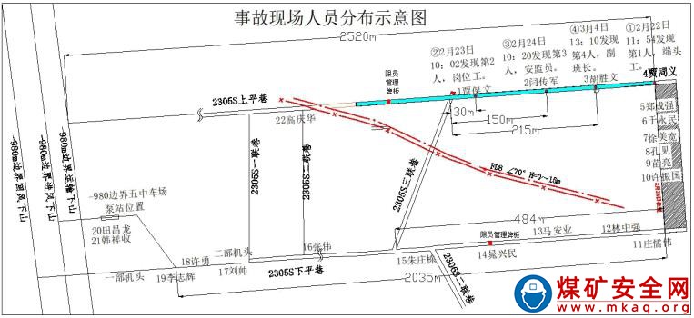 2020 年 2 月 21 日 22 時 50 分,綜放一區(qū)值班副區(qū)長侯二國組織召開班前會,安排當班工作。當班出勤 21 人,另有 1 名跟班安監(jiān)員。其中限員管理區(qū)內(nèi) 16 人,分別為盯班工區(qū)書記 1 人、安監(jiān)員 1 人、正副班長 2 人、采煤機司機 2 人、支架工 4 人、上下端頭工 4 人、刮板輸送機司機 1 人、機電維修工 1 人;限員管理區(qū)以外 6 人,分別為泵站崗位工 3 人、皮帶司機 2 人、限員管理員 1 人(見表 1)。當班班長林中強帶領職工到達工作地點后,各自按照崗位分工組織生產(chǎn)。22 日 1 時 20 分,采煤機開始割煤。2 時 50 分,下平巷第一部帶式輸送機機頭溜煤眼被矸石堵塞,采煤機停機。3時30 分,工區(qū)書記高慶華帶領支架工張偉離開工作面,去查看溜煤眼堵塞情況,至事故發(fā)生時 2 人未返回工作面。3 時 32 分,采煤機恢復割煤作業(yè)。5 時 51 分,采煤機停機,當班割煤 1 刀及 75 組支架長度。限員管理員賈保文駕駛單軌吊進入限員管理區(qū)內(nèi)運輸物料,副班長胡勝文帶領端頭工賈同義進入上平巷及端頭進行收尾工作,此時安監(jiān)員閆傳軍也從工作面進入上平巷。6 時 17 分 22 秒,2305S 工作面上平巷及三聯(lián)巷發(fā)生沖擊地壓。工作面部分人員被沖倒,語音電話失效,下端頭作業(yè)人員感到從工作面吹來一股強大氣流。班長林中強意識到出事了,立即帶領人員跑向工作面上端頭查看,發(fā)現(xiàn)上端頭煤塵很大,能見度極低,然后帶領人員迅速由工作面經(jīng)下平巷來到 2305S 三聯(lián)巷,發(fā)現(xiàn)三聯(lián)巷上段的頂板和兩幫均嚴重變形,人員無法通過,便迅速返回下平巷,經(jīng) 2305S 二聯(lián)巷到達工作面上平巷,發(fā)現(xiàn)限員管理站以里巷道頂板及兩幫均已發(fā)生嚴重變形,于是立即去尋找電話報告。6 時 38 分,林中強向綜放一區(qū)值班副區(qū)長侯二國電話匯報事故情況。6 時 40 分,侯二國向調(diào)度室匯報 2305S 工作面發(fā)生沖擊地壓事故。7 時 16 分,林中強對現(xiàn)場人員清點確認后,向調(diào)度室匯報閆傳軍、胡勝文、賈保文、賈同義等 4 人被困。經(jīng)核實,沖擊地壓事故發(fā)生時,限員管理站以里有 14 人,其中 4 人被困,限員管理站以外 8 人 。