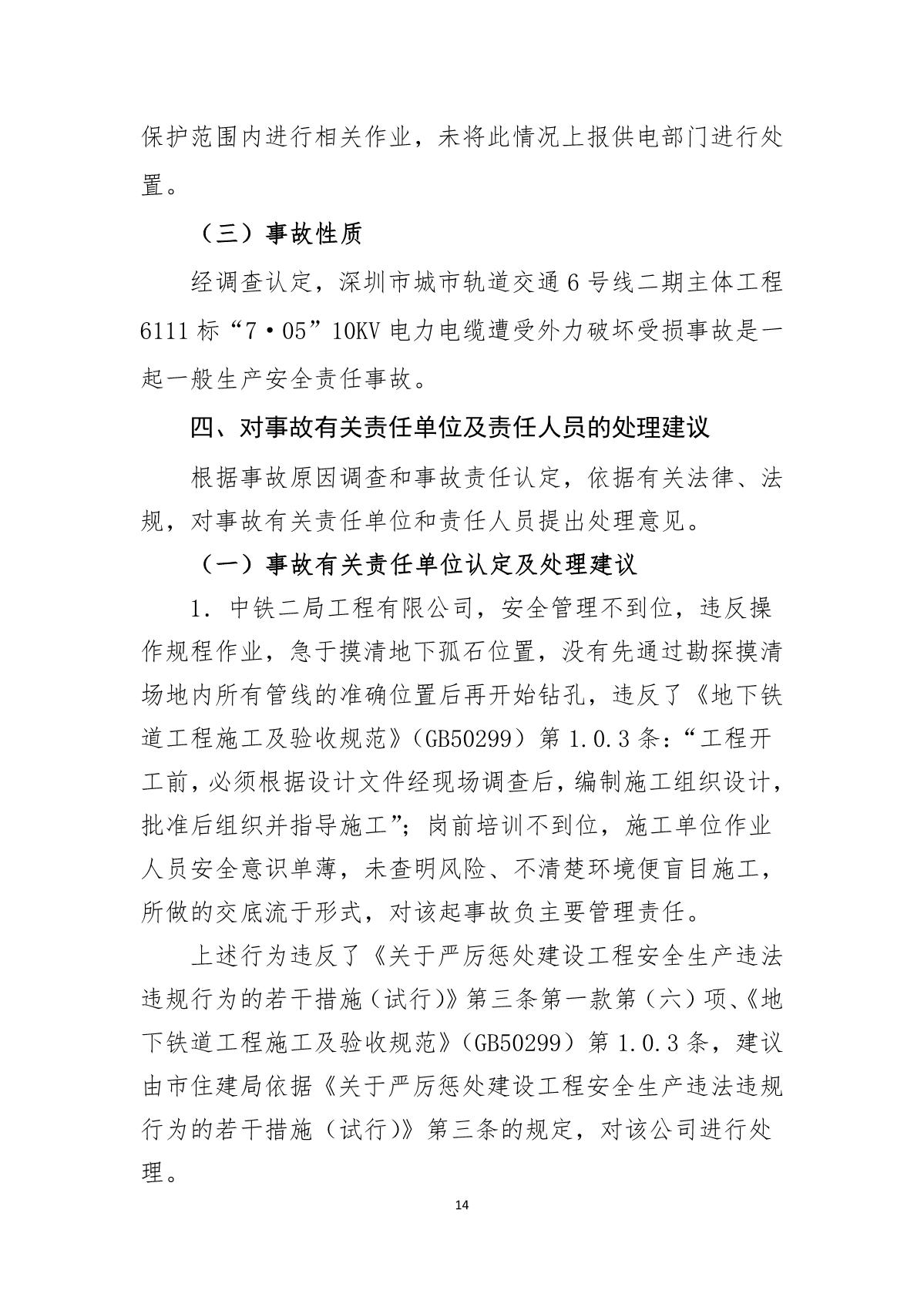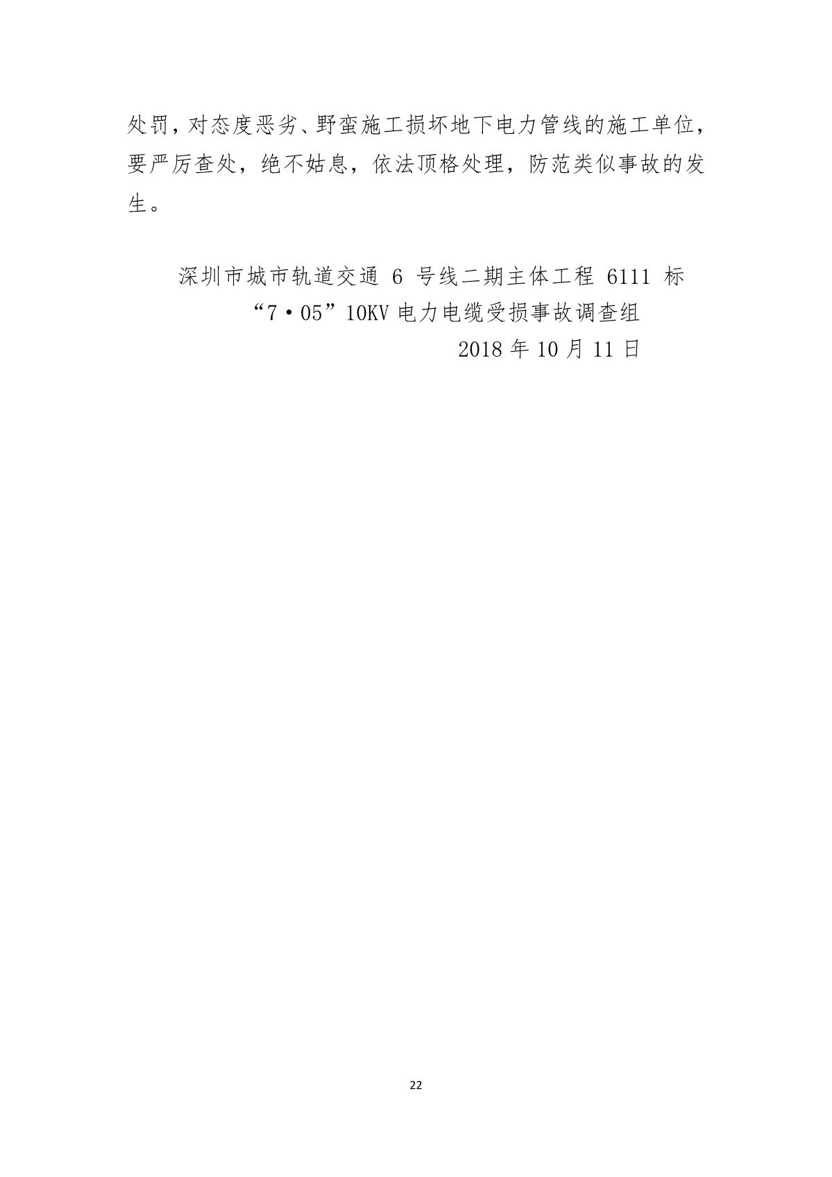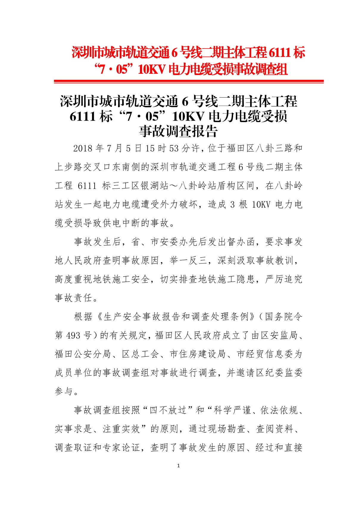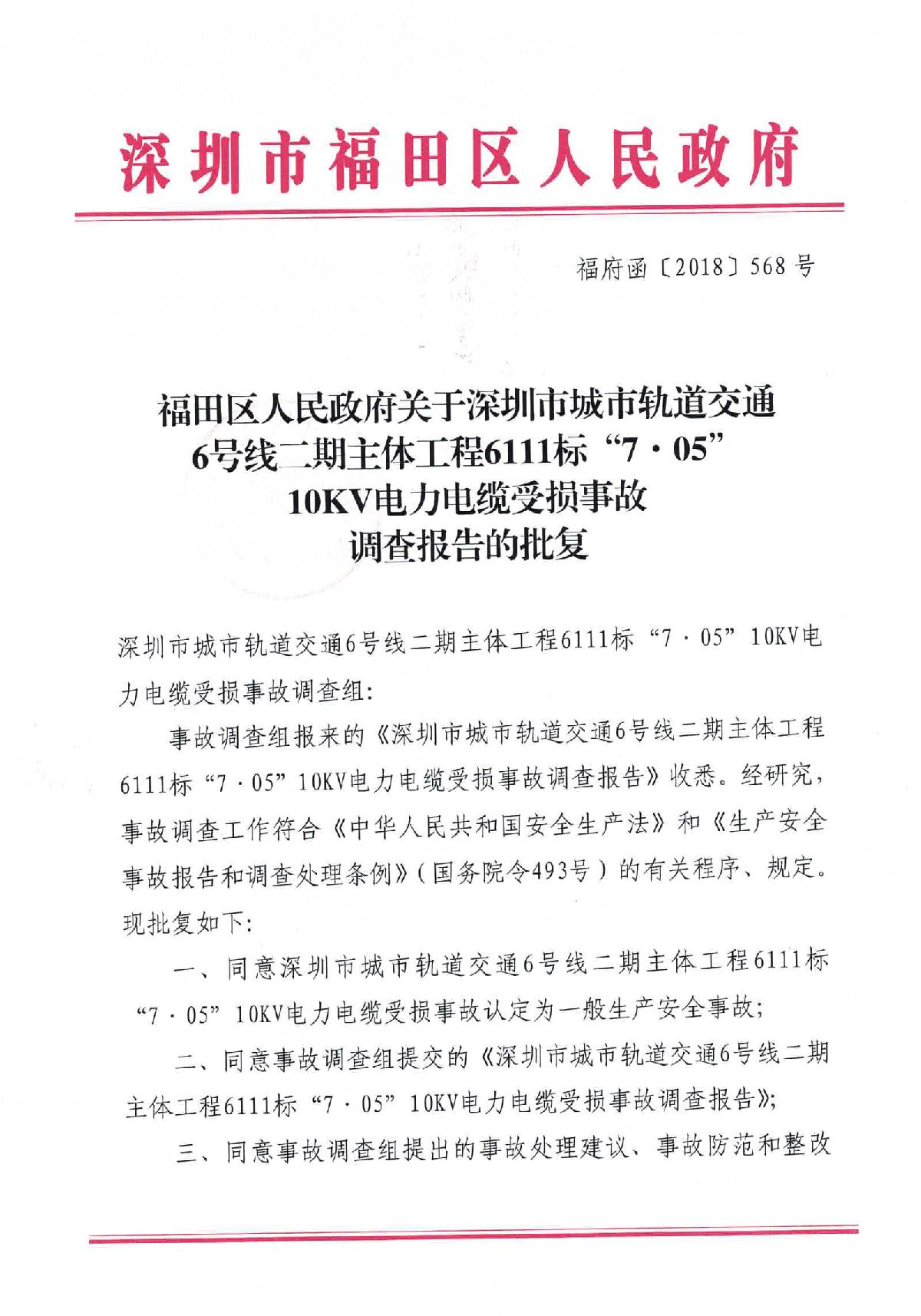 福田區人民政府關于深圳市城市軌道交通6號線二期主體工程6111標“7.05”10kv電力電纜受損事故調查報告