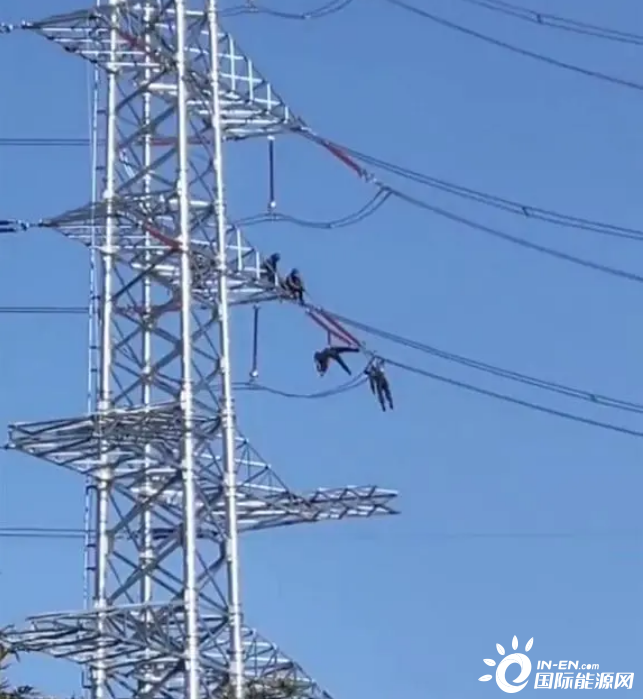 網(wǎng)友拍攝的視頻內(nèi)容顯示,在一道路附近的高壓線桿上,兩名人員的身體懸掛在線纜上一動(dòng)不動(dòng),疑似發(fā)生觸電事故,一旁則是架設(shè)的高壓電力設(shè)施。極目新聞?dòng)浾咦⒁獾剑瑑擅藛T身穿黑色衣服,頭戴安全帽,因事發(fā)地位于道路交叉口,附近來(lái)往行人和車輛較多,不時(shí)有市民在一旁圍觀。