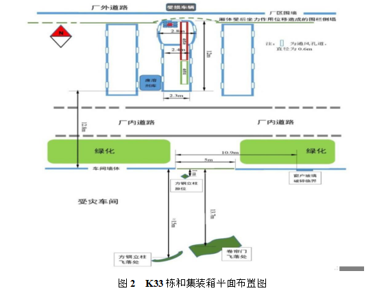 在廠區(qū)的平面布置見(jiàn)圖 1,K33 棟和集裝箱周邊環(huán)境情況見(jiàn)