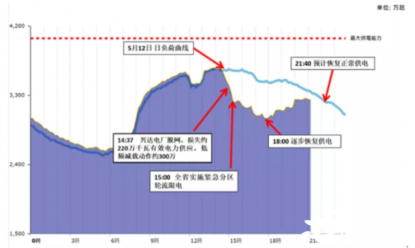 5月13日14時37分,興達電廠因接入345千伏路北變電站母線故障,導致電廠電力送出受阻,兩臺燃煤及兩臺燃氣機組脫網,系統損失有效電力供應約220萬千瓦,造成臺灣系統頻率驟降,為維持電網穩定,電力系統在第一時間自動啟動低頻卸載約300萬千瓦。臺電評估短時間內無法立即復電,為維系電力系統安全,自下午3時起執行緊急分區輪流停電,最大限電達到350萬千瓦。事故過程系統負荷變化曲線下圖所示。