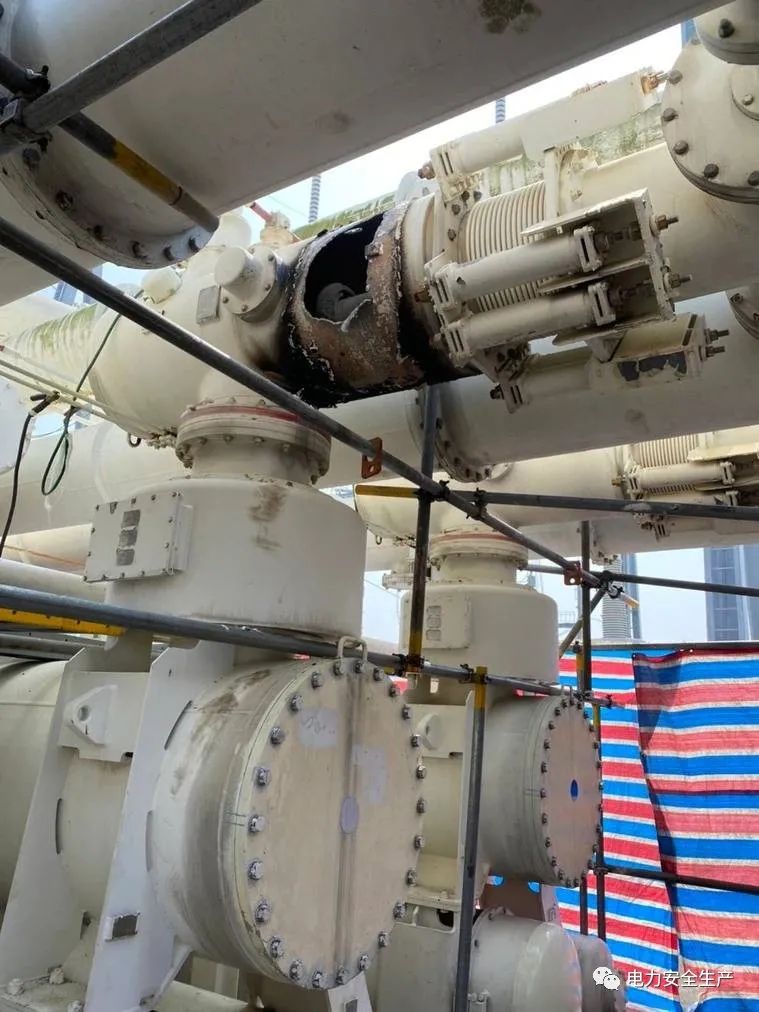 發生爆炸的電廠345千伏GIS的里的刀閘放電,殼體燒穿了