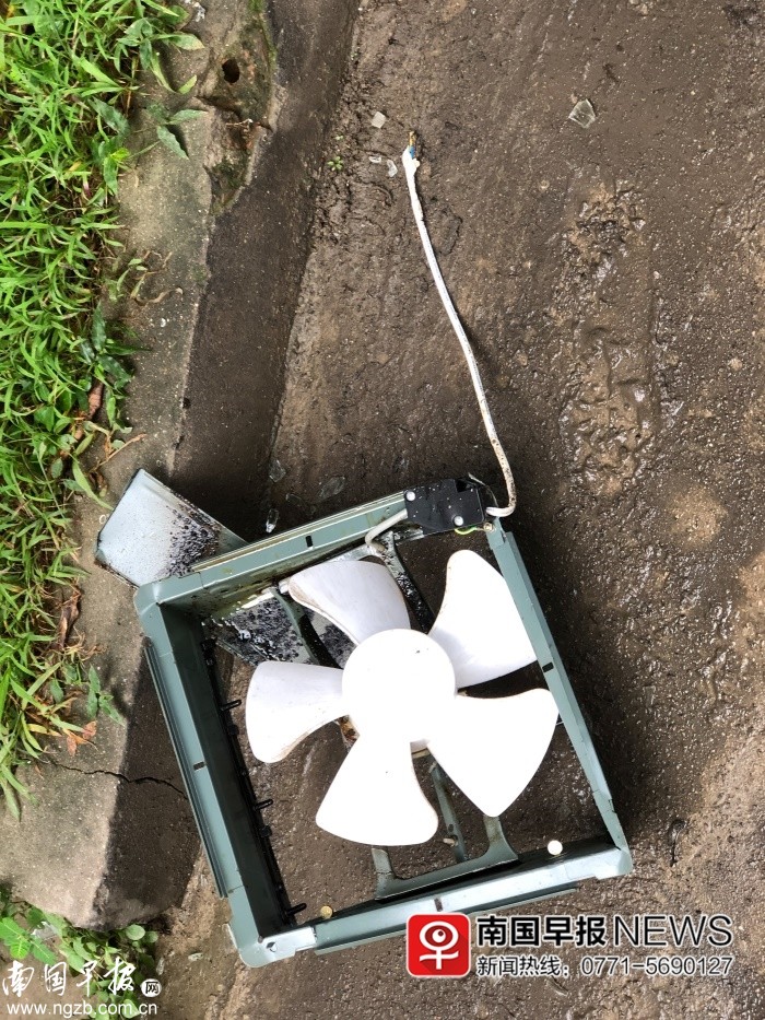 ▲被炸飛掉落樓下地面的排風扇。