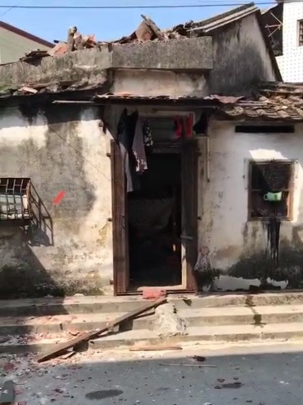 從網友提供的事故現場視頻中我們可以看到,該棟民宅的屋頂嚴重受損,大面積的瓦片被炸飛,掉落在大門口附近。