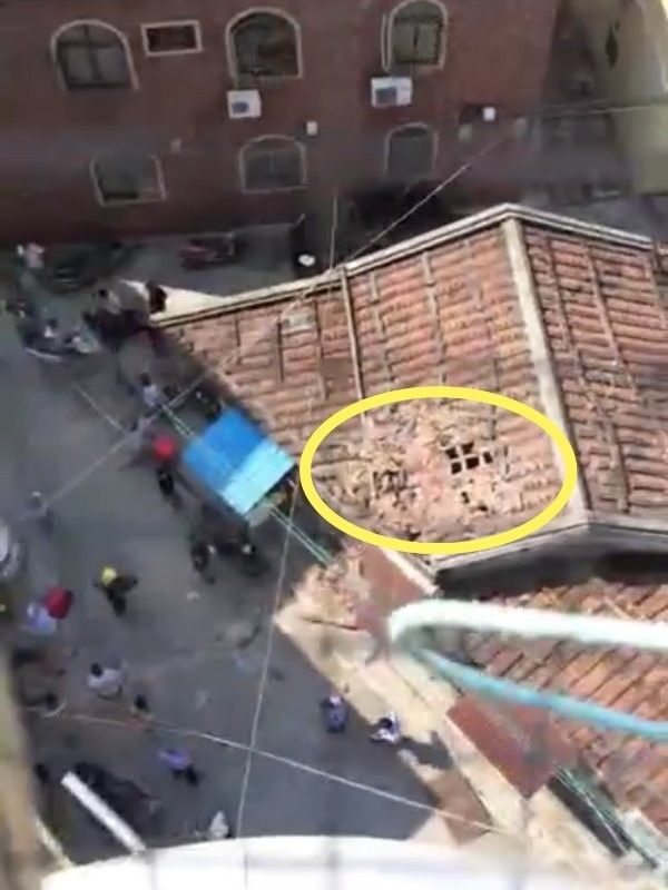 現場可以看到,該棟民宅的屋頂有四分之一的瓦片被毀,從隔壁的樓上往下看時,可以看見屋頂已經出現一個大洞。